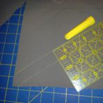 Once the seam was removed, I laid the pants flat, aligning the outer seams. Using my rotary cutter, I cut off the legs. Then straightened the remaining leg, cutting off the crotch arch. Using the cut off leg sections, I filled in the area between the legs. First marking the cutoff leg to fit the area, then adding a seam allowance.