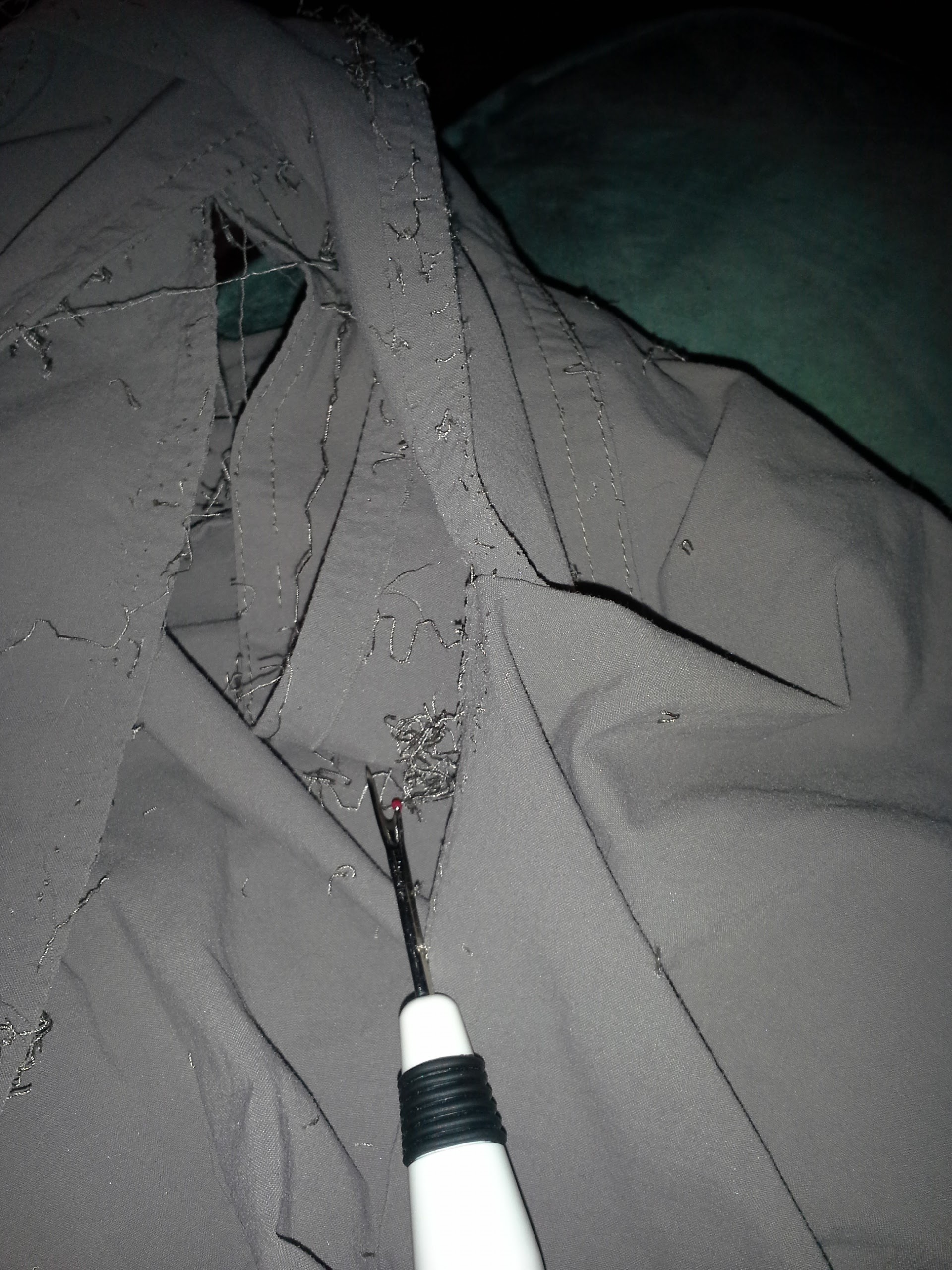 The pant has some holes near the hem, so refashioning them was a given. First was removing all the inseam stitches, which took while.