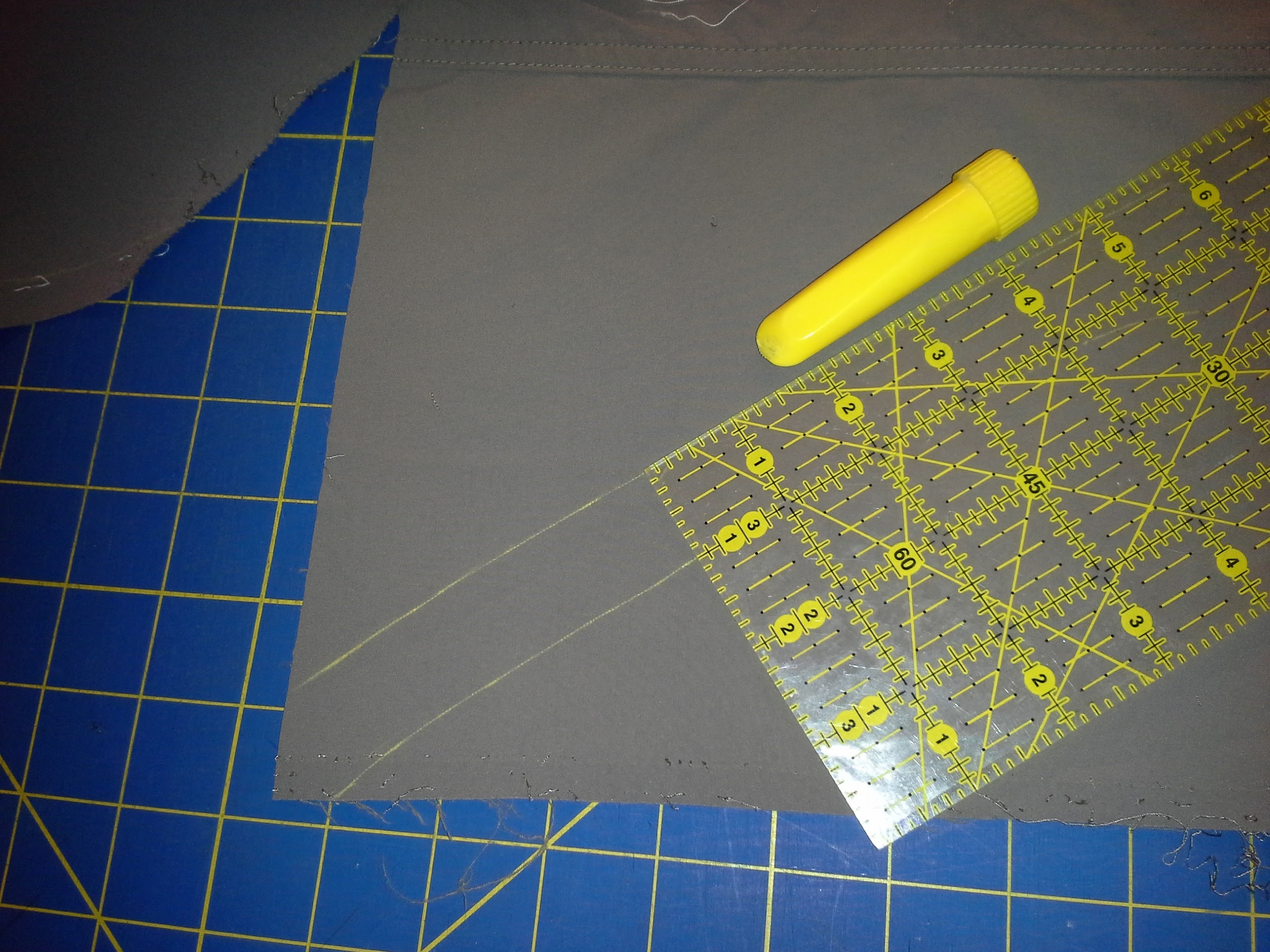 Once the seam was removed, I laid the pants flat, aligning the outer seams. Using my rotary cutter, I cut off the legs. Then straightened the remaining leg, cutting off the crotch arch. Using the cut off leg sections, I filled in the area between the legs. First marking the cutoff leg to fit the area, then adding a seam allowance.