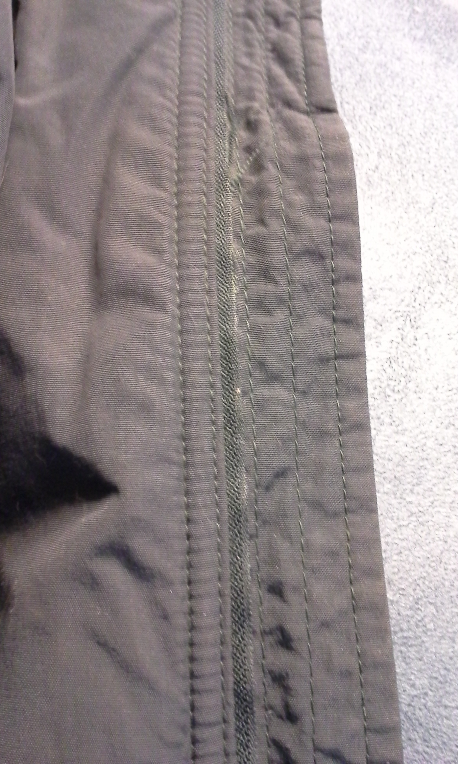 First, you have to remove the zipper. Not as easy as it sounds. The zipper is usually stitched and/or serged in at least three times. You have the initial serged seam installing the zipper, then top stitching with one to two rows of stitching. If your lucky, that’s it. But sometimes you have a wind fly behind the zipper. This is a flange behind the zipper to block the wind from getting though.