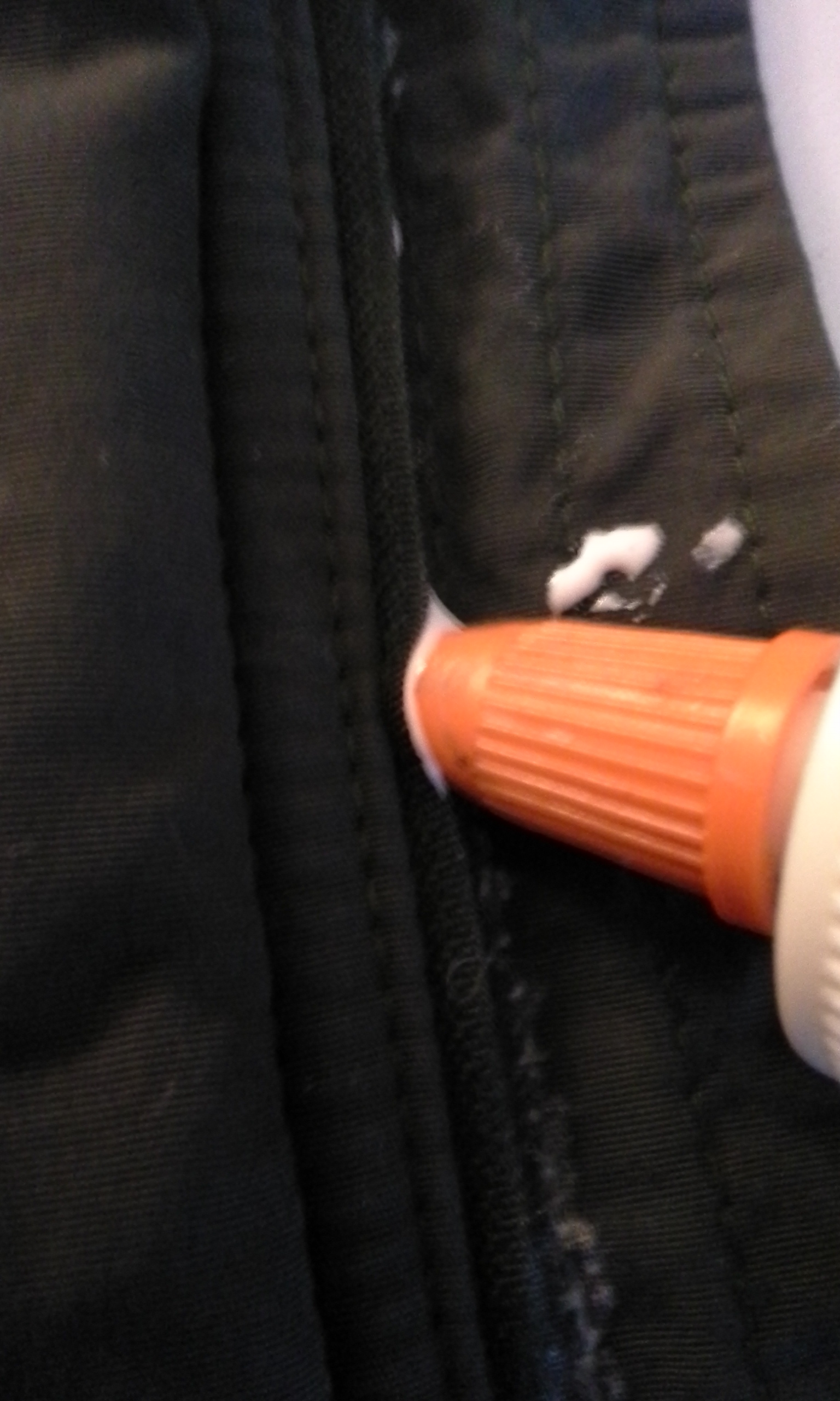 The original zipper tape ends right at the top zipper stop. New zippers extends longer for insertion into seam allowances. I cut off the excess leaving maybe an 1/8″. Using a candle, I melted the end of the tape to keep it from unraveling. Do not put the tape in the flame, just