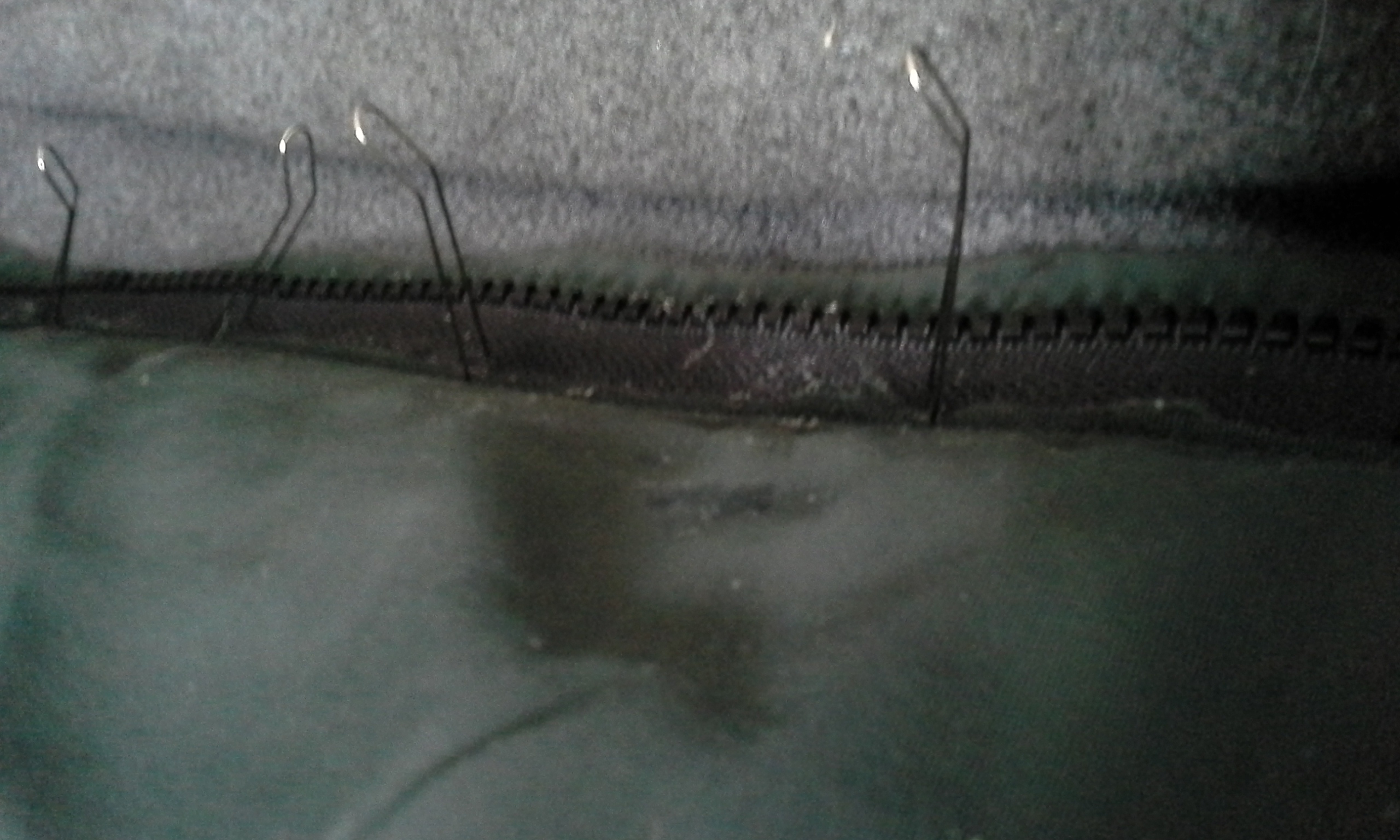 The left side of the jacket has the wind fly, so it was easy to glue the new zipper in. The right side was not. So I with the new zipper under the old zipper tape, I line the seam up as before. The teeth of the new zipper are lined up with the right side of my presser foot. To start, I had the zipper zipped up, aiding on lining up the bottom of the jacket and zipper. Hoping it would stay lined up as I guided the jacket and zipper together. Once I started sewing the seam, I unzipped the zipper and continued on.