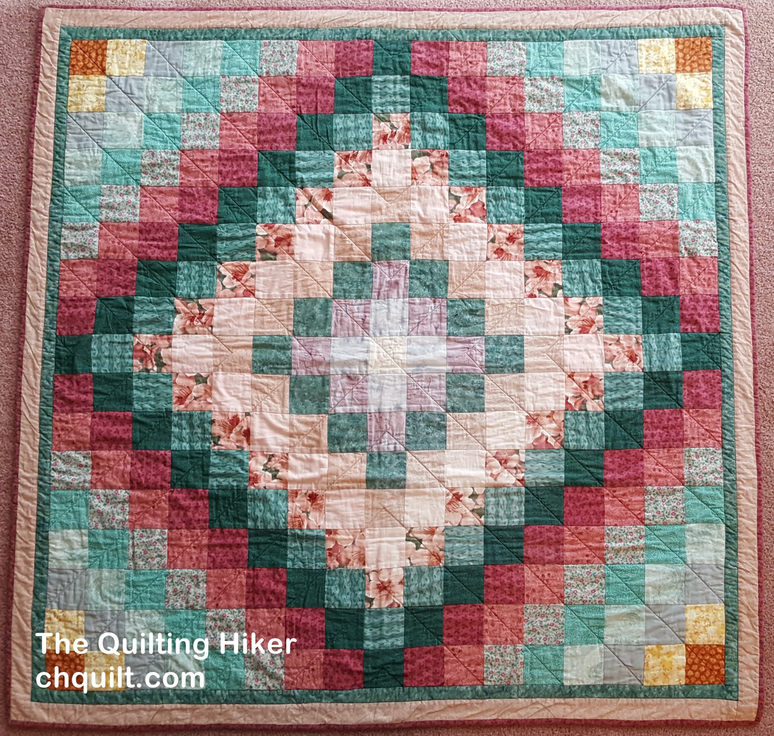 The Artist Eye – Based on a border fabric of your choosing, you create various nine patch blocks that are placed on point with one patch blocks. I love the way this quilt looks. But I have become an impatient quilter. If I can’t chain piece a bunch of blocks all at once, I’m less likely to start, never mind completing, the quilt. For this quilt, you audition different fabrics to make many different nine patch blocks, which is a bit more tedious than the strip piecing method of making them.