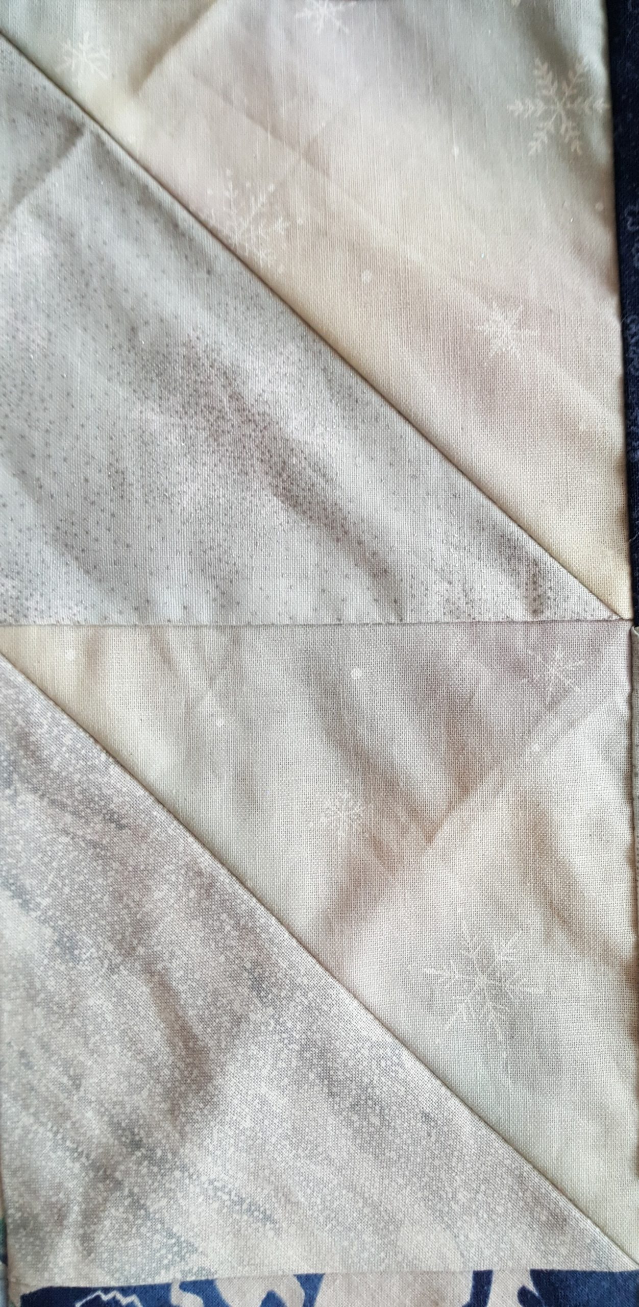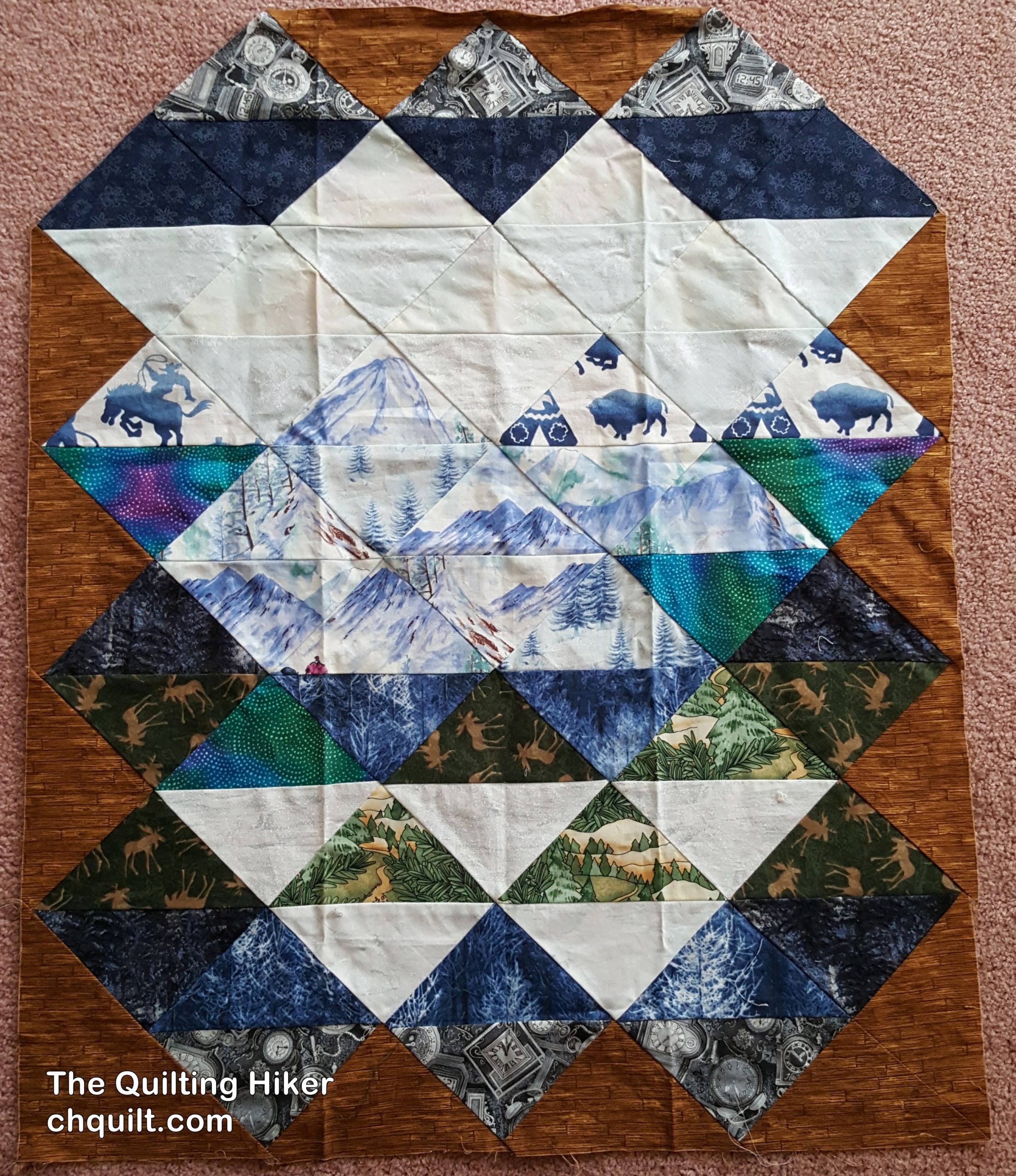 Visualization – This exercise delves more into the art quilt arena. You were to choose a moment, person, place etc. With that choice in mind, you are instructed to choose fabrics that remind you of that moment, person, or place. I choose my trip to Jackson Hole. My husband and I took a snowmobile vacation to Yellowstone and Togwotee Pass. The close up is of the snow fabric. There are clocks for the time change, buffalo, cowboys, mountains, deer, and wood for the boardwalks in Jackson. I took the upper corners off because I didn’t like the direction of the wood grain. I have yet to fix this. Now I have to find where I put them.