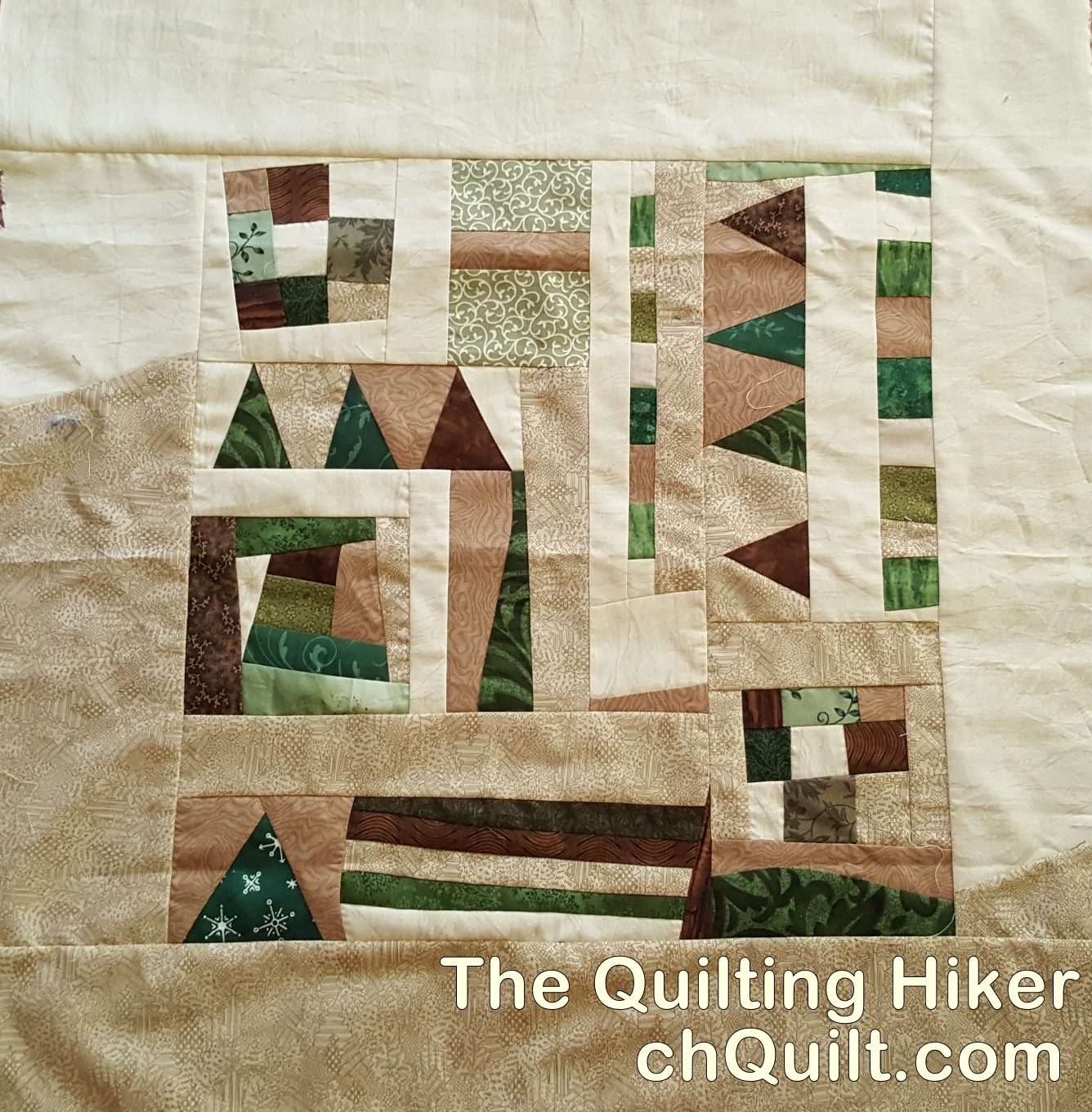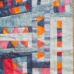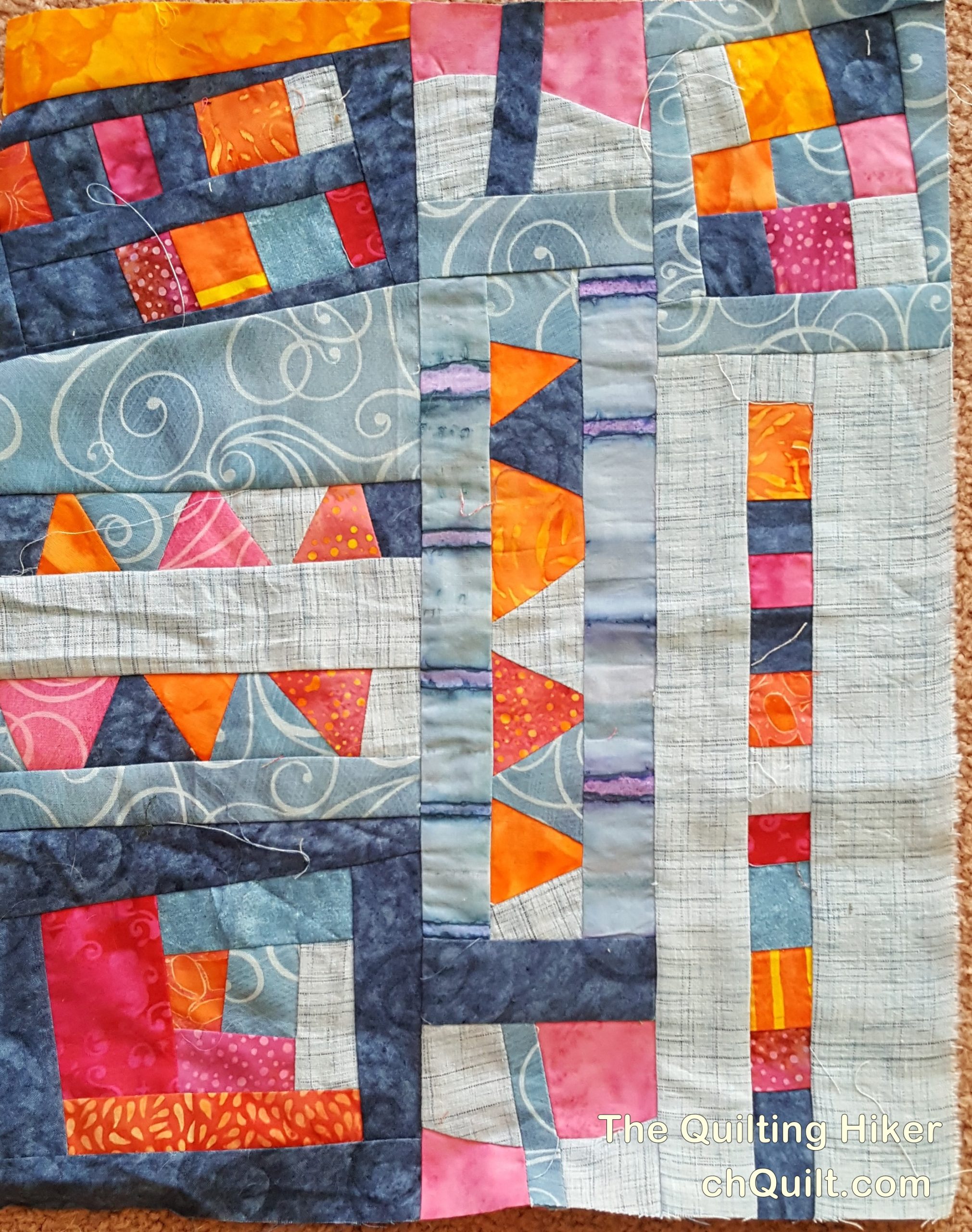 I thoroughly enjoyed myself. Timna’s suggested giving yourself a rule as a guide for choosing fabrics. This tip inspired me. The first one I used beige fabrics to start then added the green, then the brown. The second was blue with orange. As I was pulling orange scraps, some had bright pink so that color was incorporated. Now to get them quilted.