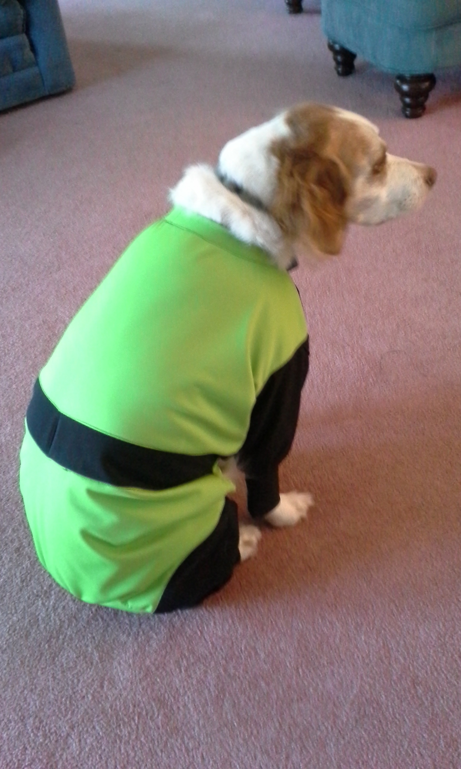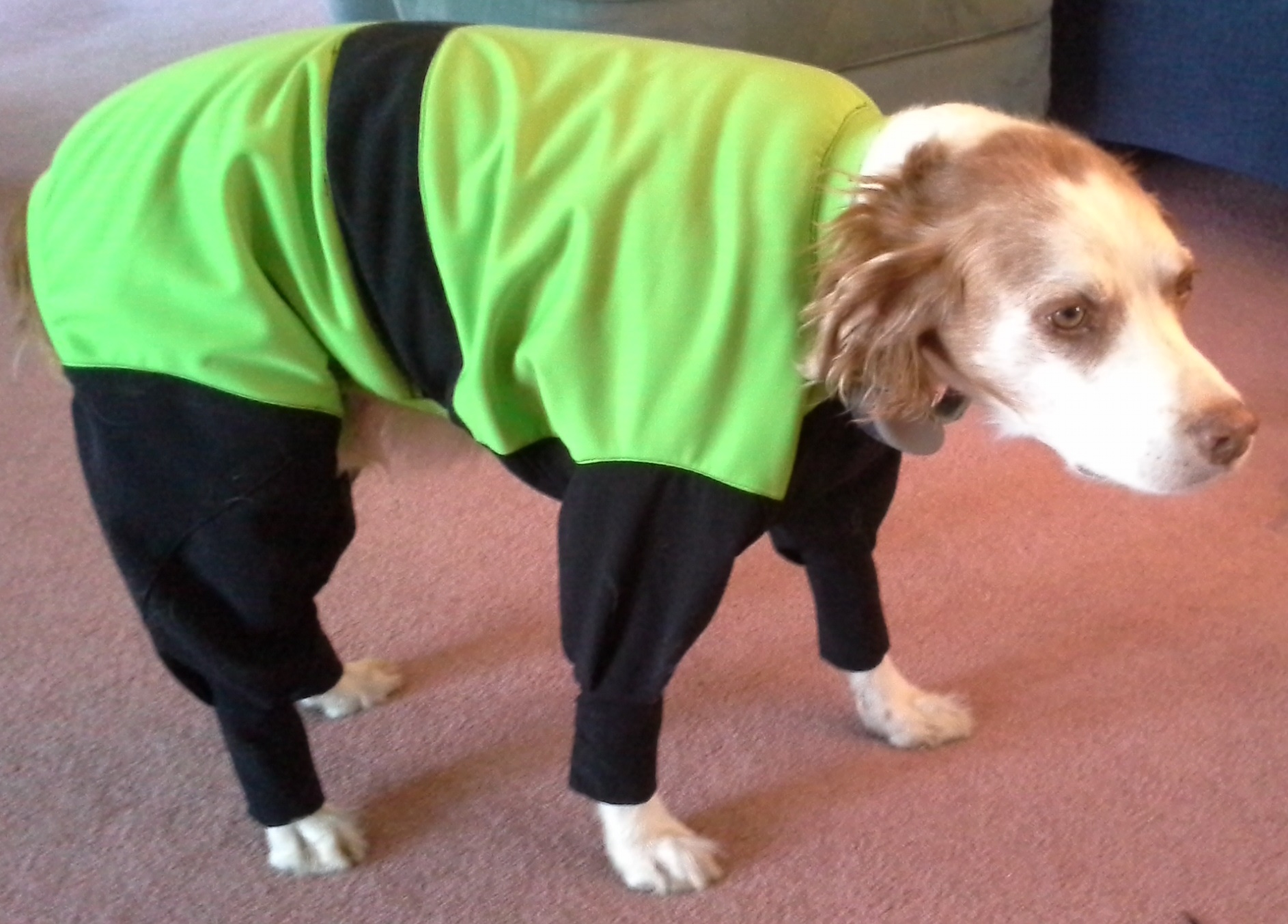 So, I set out cutting the fabric and jacket. I had to piece some of the fabric to make it large enough to cut various pattern pieces. Thus the stripe across the back. The original suit for Sport was a bit snug, so I made this one a bit bigger. I think he looks great. But he’s not too happy. Once outside on the trails, he will not care at all.