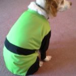 So, I set out cutting the fabric and jacket. I had to piece some of the fabric to make it large enough to cut various pattern pieces.  Thus the stripe across the back. The original suit for Sport was a bit snug, so I made this one a bit bigger.  I think he looks great. But he’s not too happy. Once outside on the trails, he will not care at all.