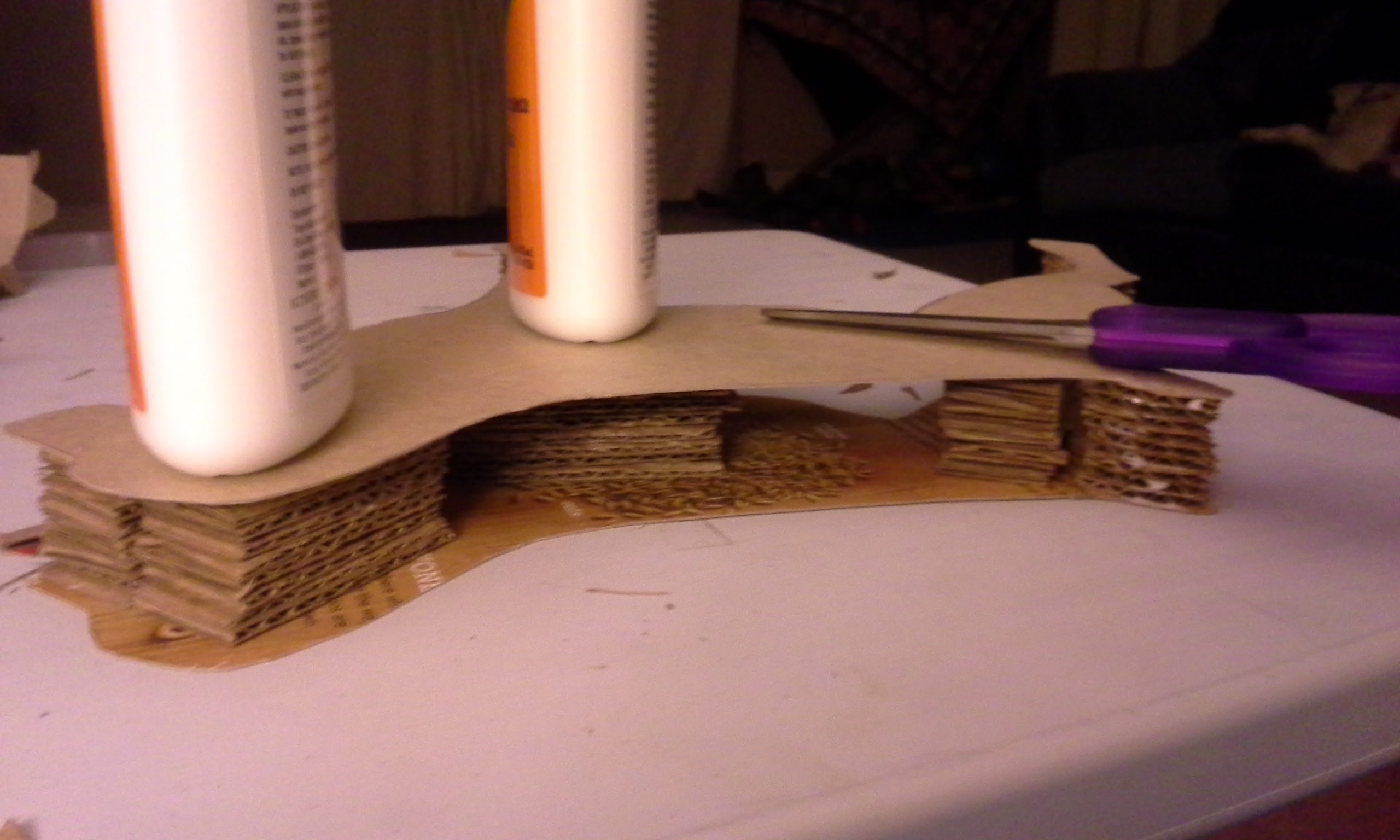The sculpture as a whole is a bit uneven. But it does stand on its own. If I ever do it again I will make the corrugated cardboard layers throughout the entire form. That way there will be more stability to the end product.