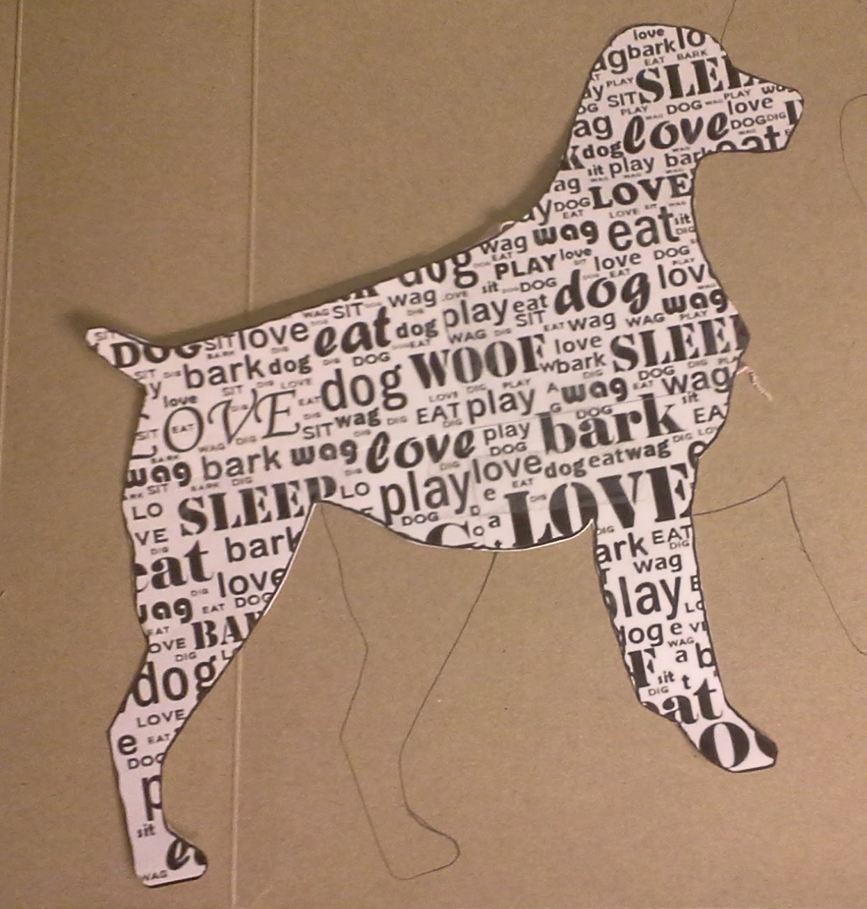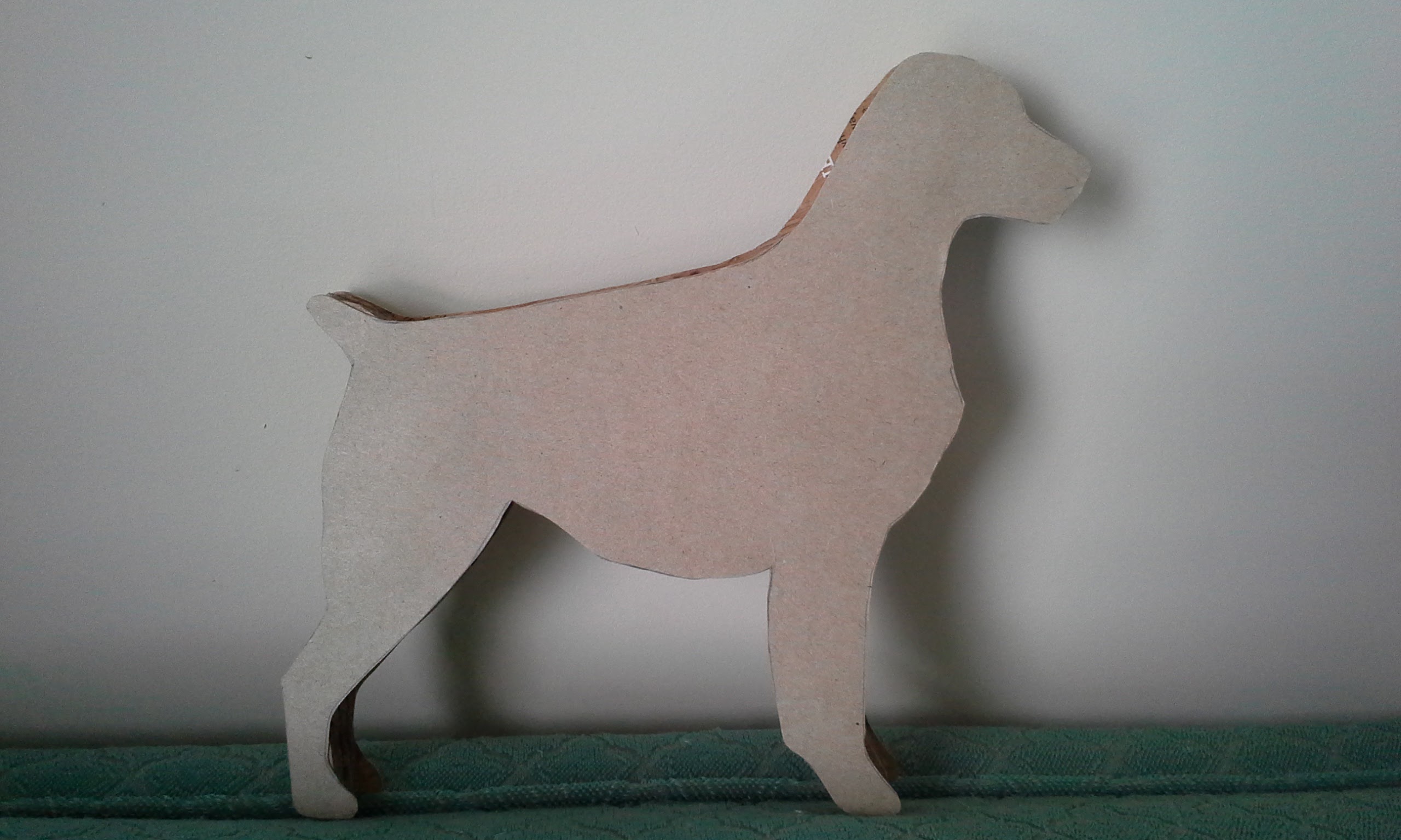 First, I looked for a silhouette of a Brittany Spaniel. I then enlarged it to the size I wanted. Next, was tracing it on cardboard from a cereal box. I cut out two, one in reverse. I first tried to make a 1 inch wide strip for the edge. That did not work. The legs were too narrow to curve the edging around. So I settled for making blocks out of corrugated cardboard. I wanted to make the sculpture 1 inch thick. I set it to dry overnight.